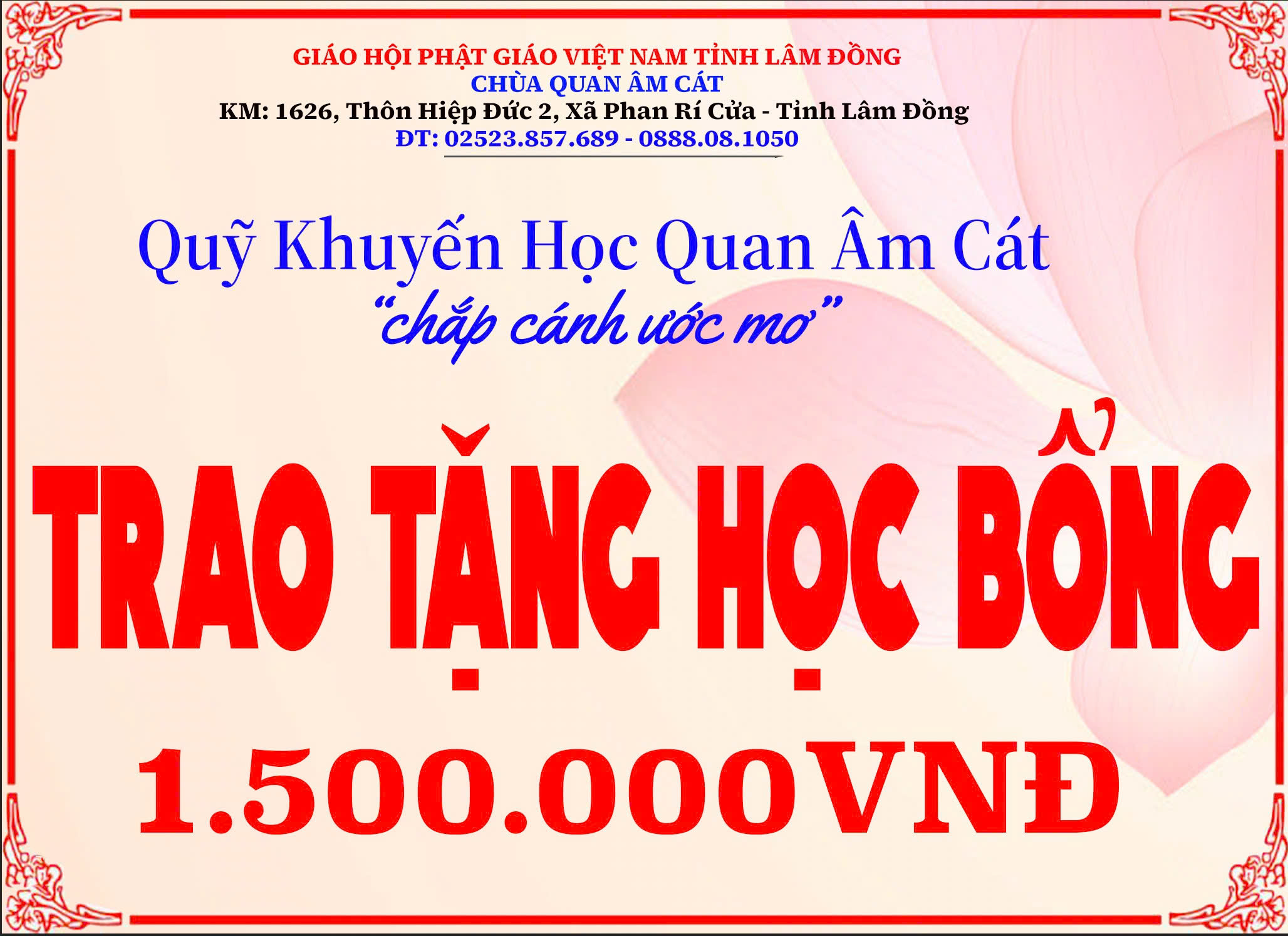 Với tinh thần “từ bi, hỷ xả” và mục đích chắp cánh ước mơ cho những học sinh có hoàn cảnh khó khăn, ngày … tháng … năm, Thượng toạ Thích Hạnh Giáo – Trưởng ban Quản trị Chùa Quan Âm Cát, đã đại diện Quỹ Khuyến học Quan Âm Cát trao tặng 04 suất học bổng, mỗi suất trị giá 1.500.000 đồng, đến với bốn em học sinh đang rất cần sự giúp đỡ của cộng đồng.